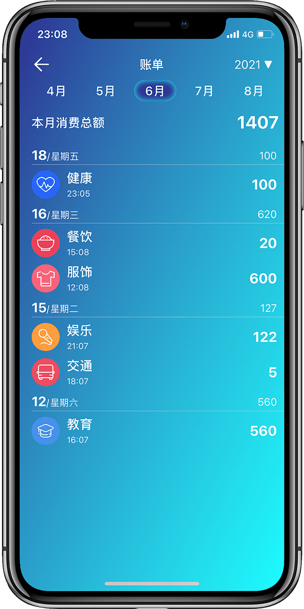 支持按年和月查看账单,账单按月提供总额统计功能,历史账单一目了然!